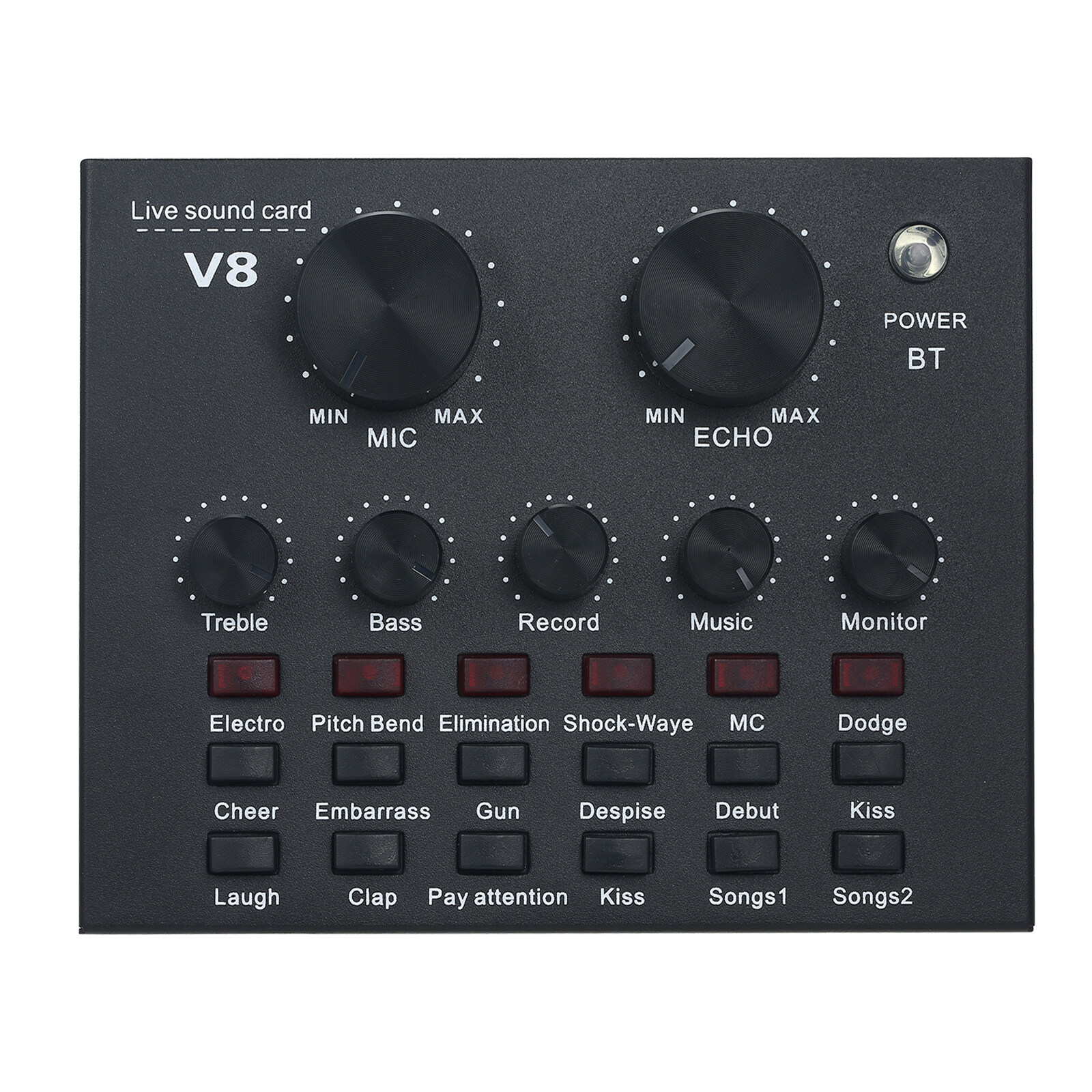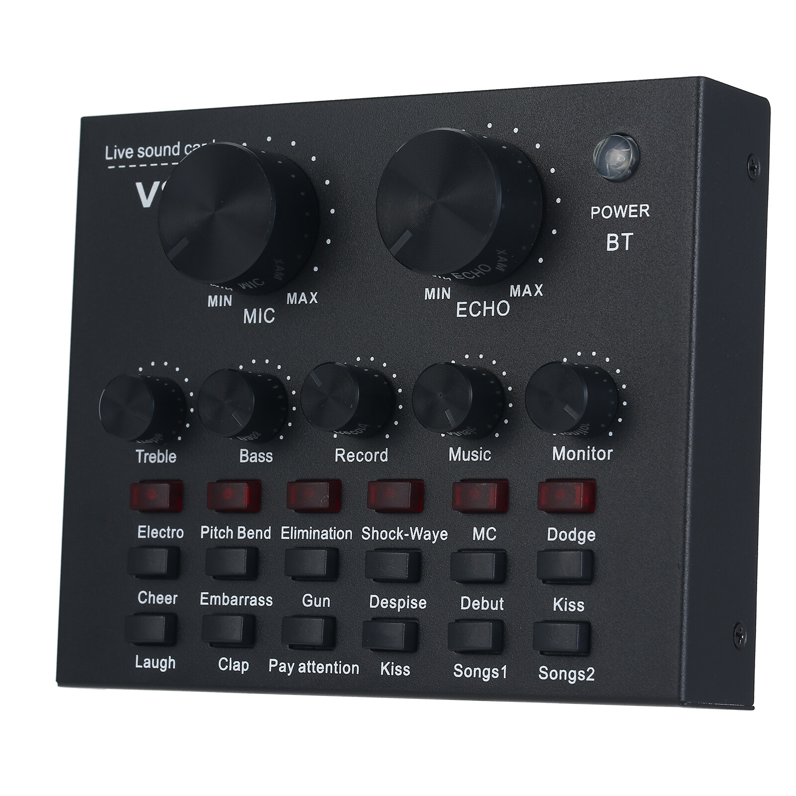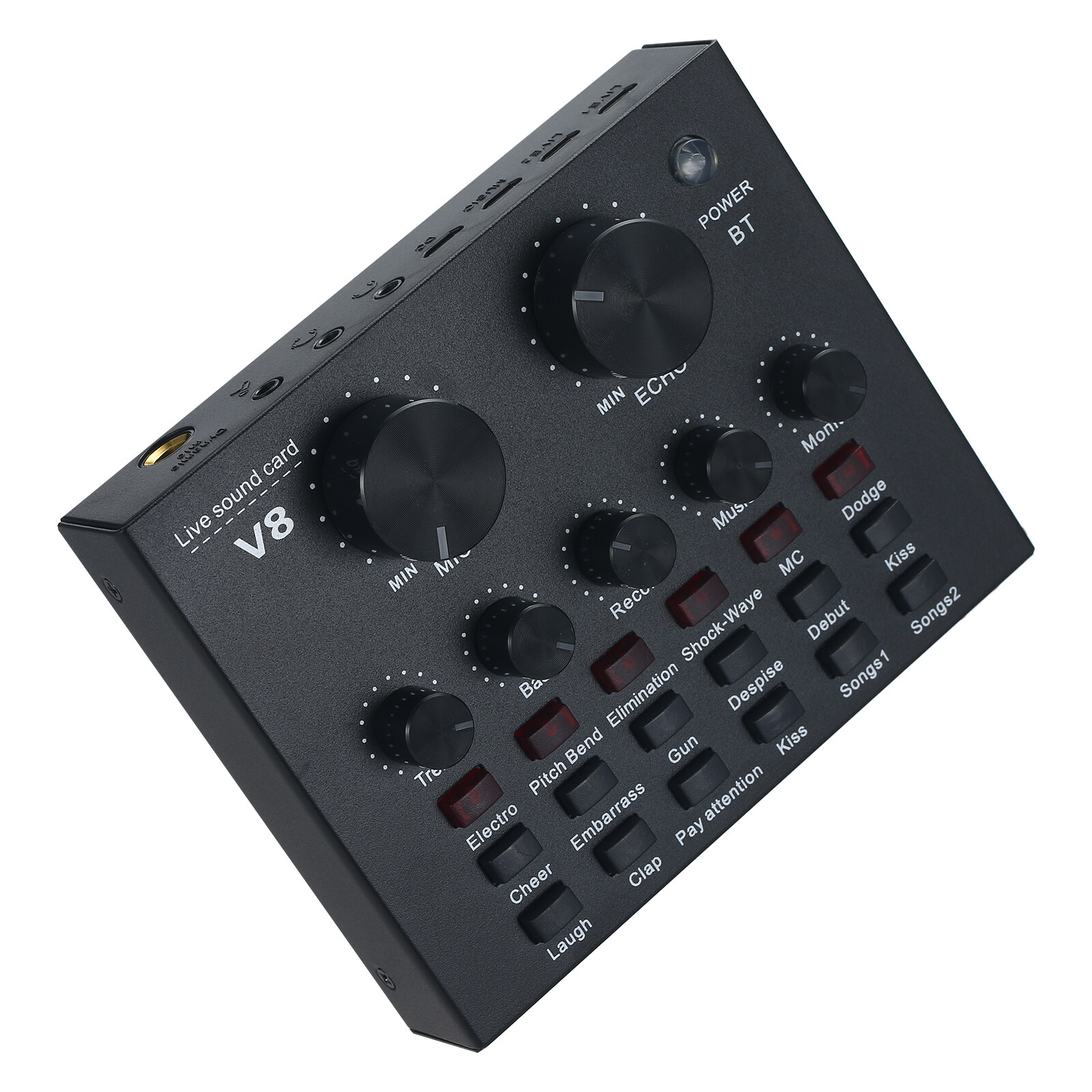 Independent control knob with adjustable microphone volume, reverb volume, treble, bass, recording volume, music volume, monitor volume.