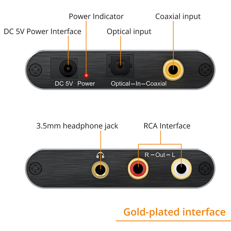 • Converts coaxial or toslink digital audio signals to analog L/R audio and connects to an external device such as an amplifier via standard RCA jacks