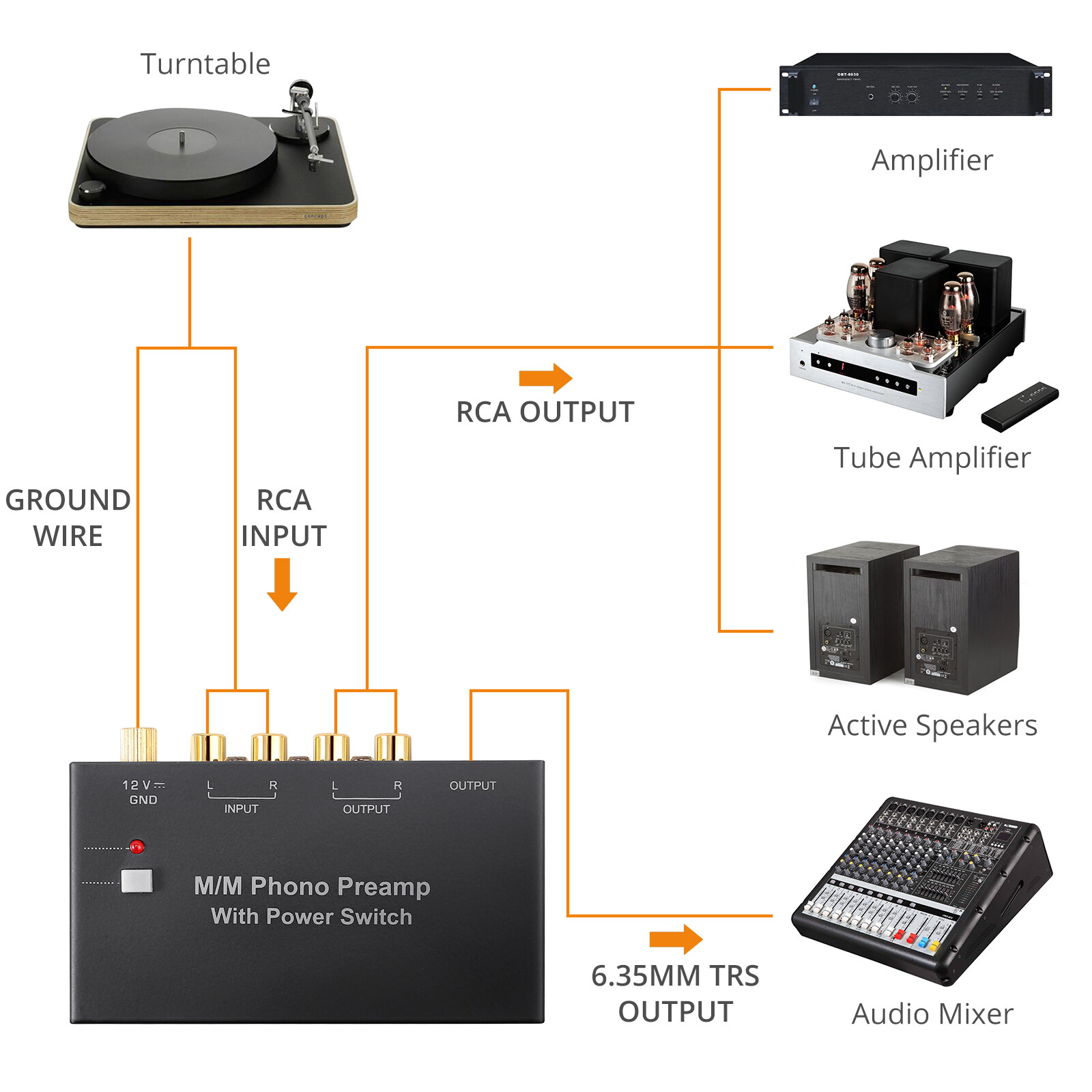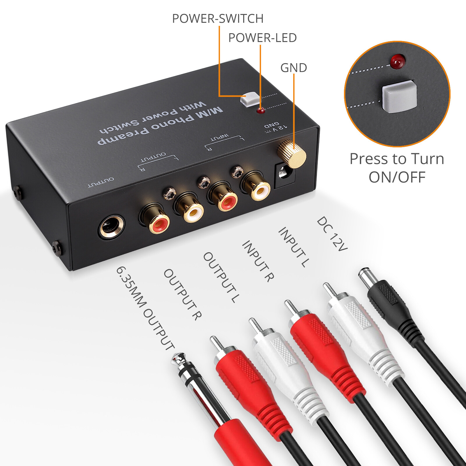 Unique switch button design, designed with grounding post to protect your turntable.