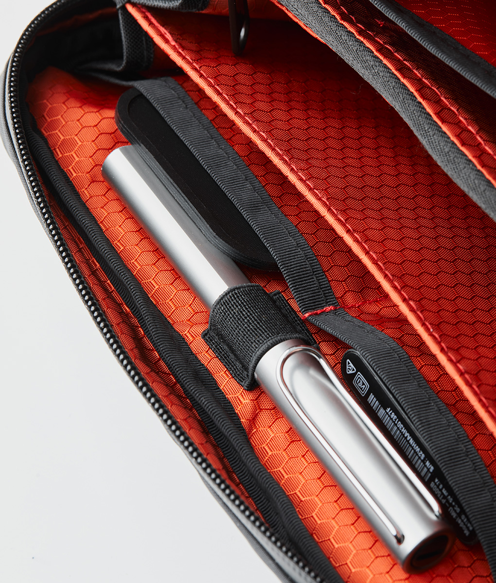 - Compartments are lined with Ripstop Nylon in Blood Orange