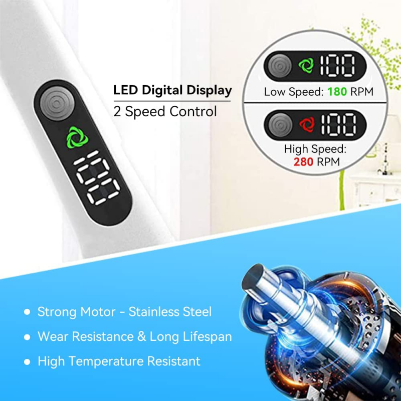 【 2 Speed Control & Digital Display 】, GOODPAPA brush set 2 working speed, ① Low Speed: 180r/Min ; ②High Speed: 280r/Min; When the scrubber is in low gear, you can squeeze by gravity without pressing the button to make the machine reach high gear; ③ Digital Display: LED display support power 100% clear prompt process to avoid the interrupted of cleaning.