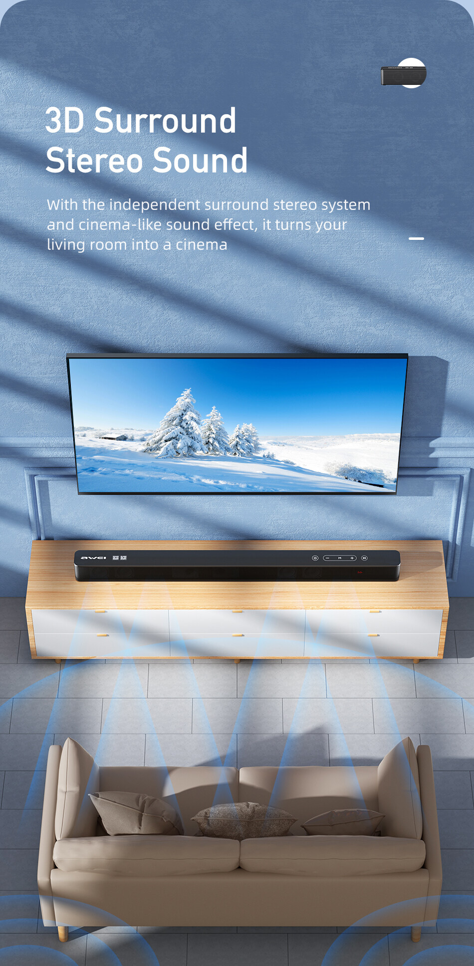 Awei Y998 TV Soundbar Speaker 33Inches Wireless Bluetooth Soundbar Home Theater With 8 Built-in Sound Units Support Bluetooth/Optical/SPDIF/AUX