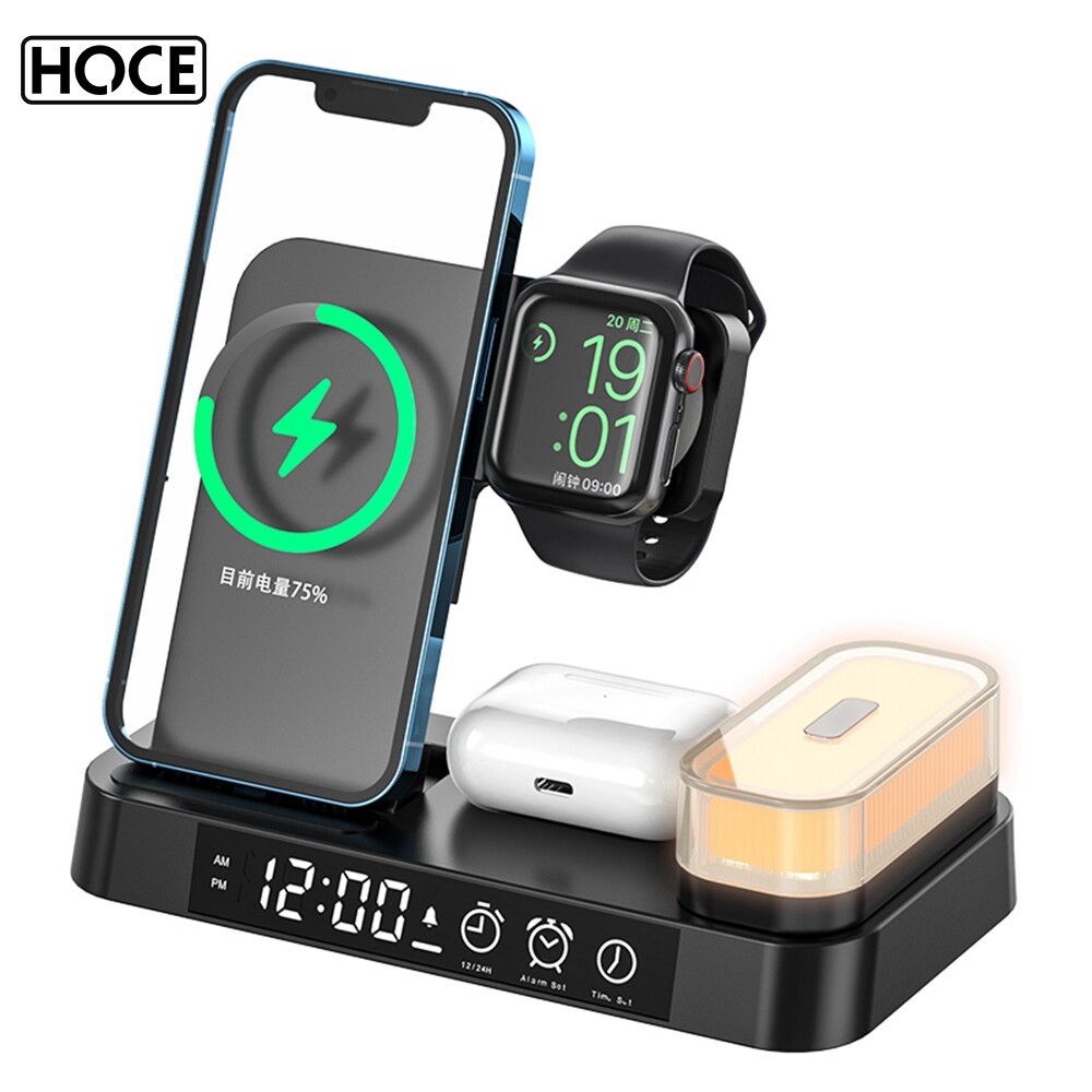 HOCE 30W 3 in 1 Qi Wireless Charger For iPhone 14 13 12 11 Pro Max XR XS X Apple Watch 8 7 6 5 4 3 2 SE Alarm Clock Fast Charging Station With LED Light For Airpods Pro 3