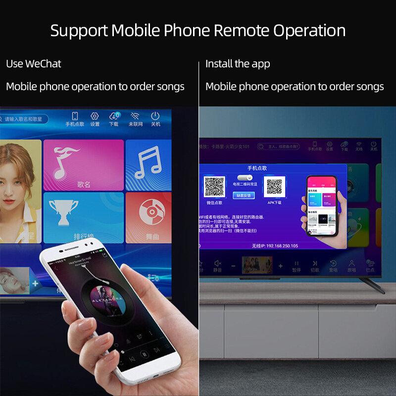 19-inch karaoke touch screen machine player, built-in wifi, support youtube installation.Built-in DSP, karaoke sound is nice, supports HDMI output and can be directly connected to TV.The karaoke touch screen machine player supports RCA audio output, which can be easily connected to the speaker system.1 million + cloud songs, popular music is updated monthly, and you only need to have a network to download the latest songs for free.The content of the songs are mainly Chinese and English songs, including various styles of music, pop, rock, jazz, folk, etc. Of course, there are also children's songs, and children can also sing karaoke! ! !The touch screen machine player has no stand and is placed directly on the desktop.There is no need to manage the hard disk storage manually. When the hard disk storage is full, the downloaded new songs will automatically overwrite the oldest previously downloaded old songs.