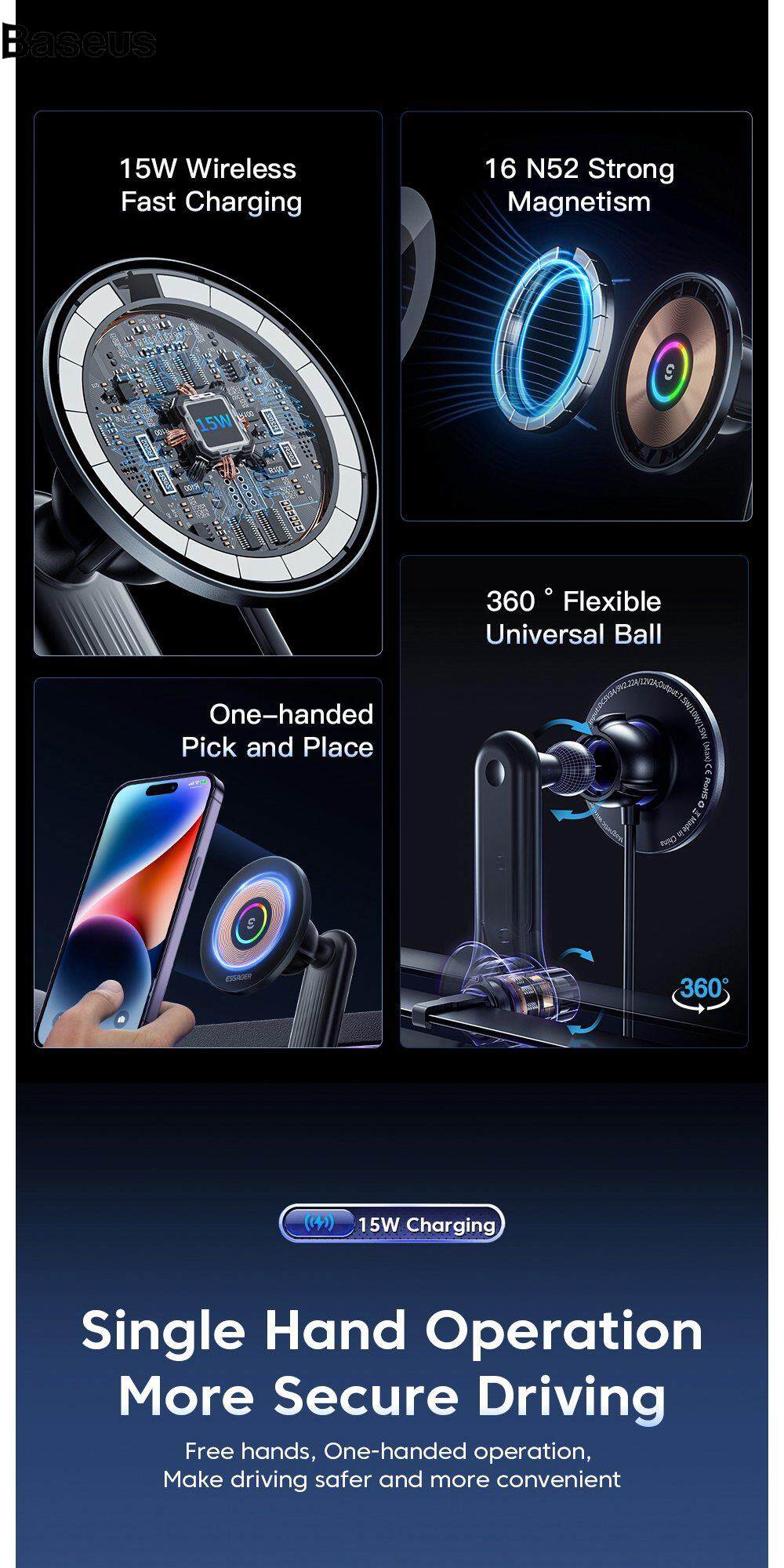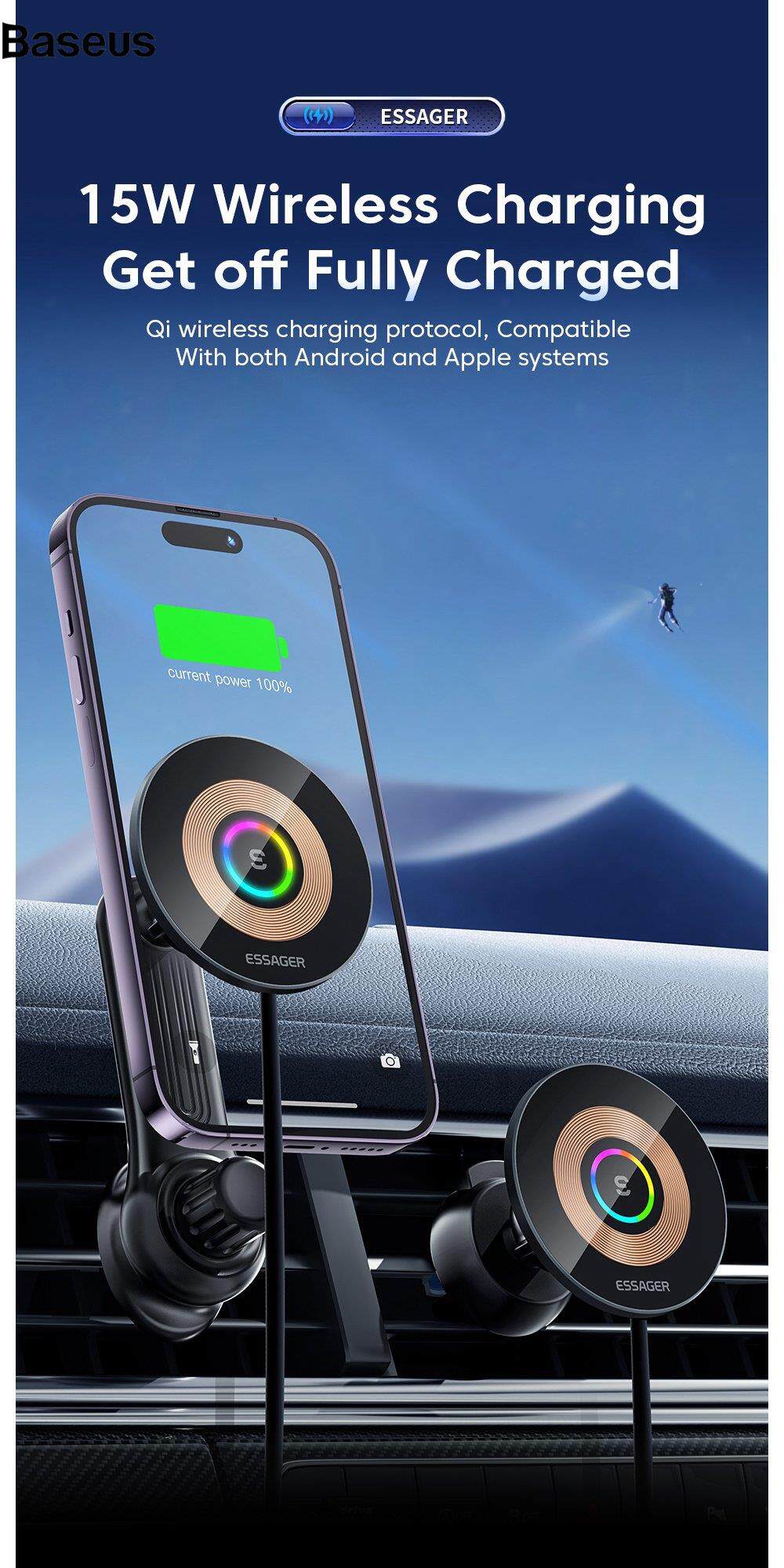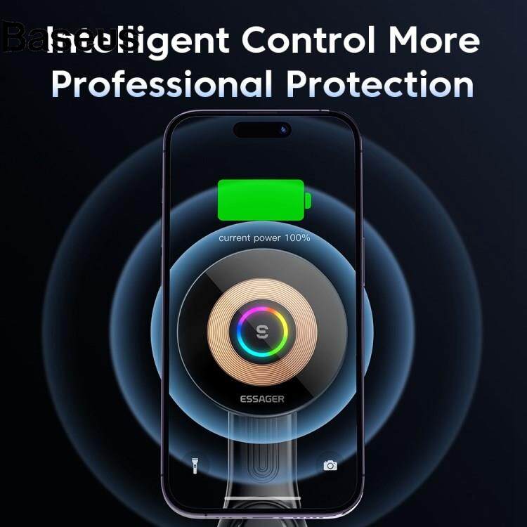 Baseus ESSAGER Magnetic Wireless Car Charger 15W Fast Charging Holder Car Charger Phone Mount with RGB Light for iPhone, Huawei (Standard Version)