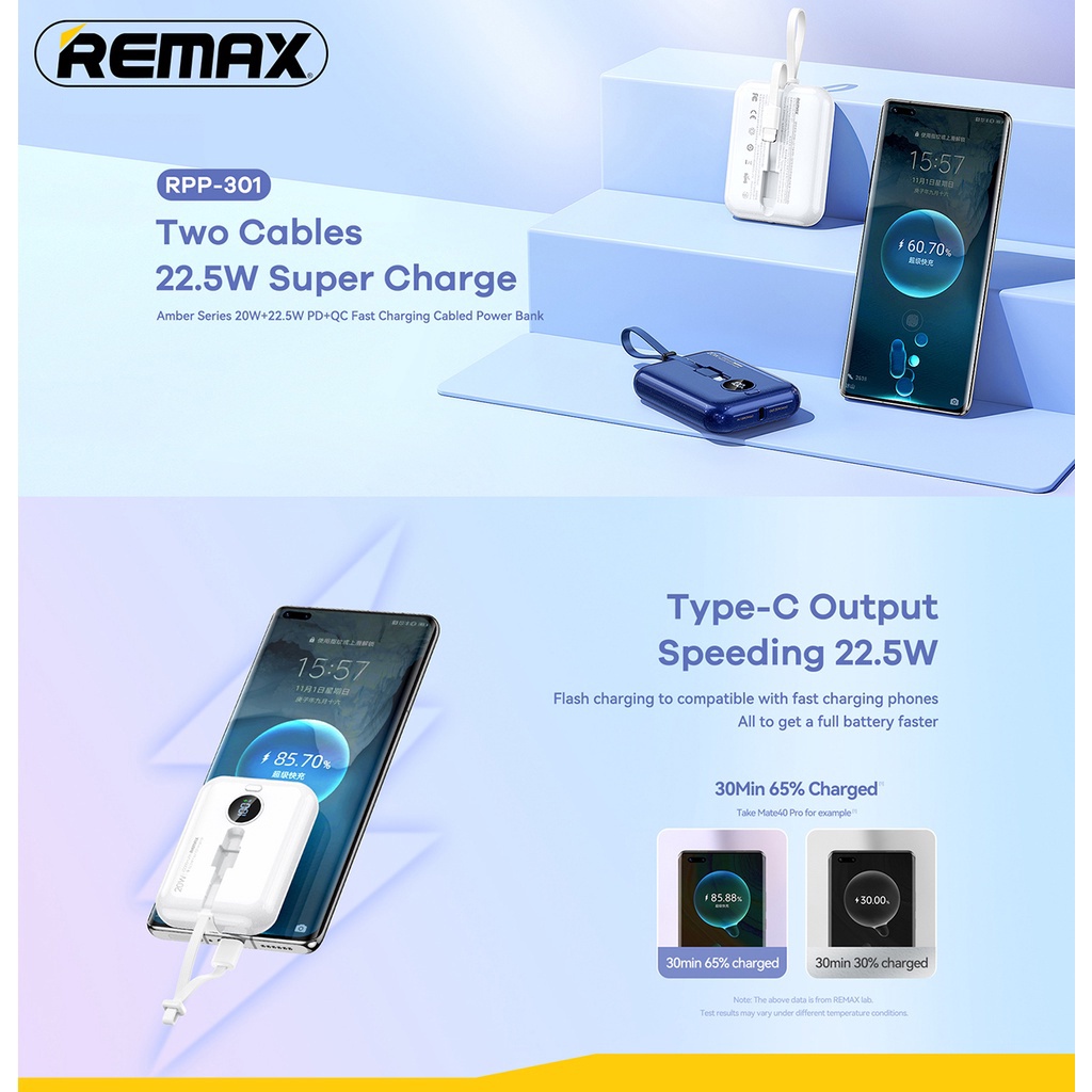 Cabled Power Bank * Model: RPP-301 * Color : Blue / White * Size: 83*61*25.5mm * Weight : 185g * Features: - Compact to hold in one hand - Two built-in cables, charging 3 devices at once - The built-in cable can work as a portable lanyard - Smart digital display, clear battery status - The charging cables are detachable