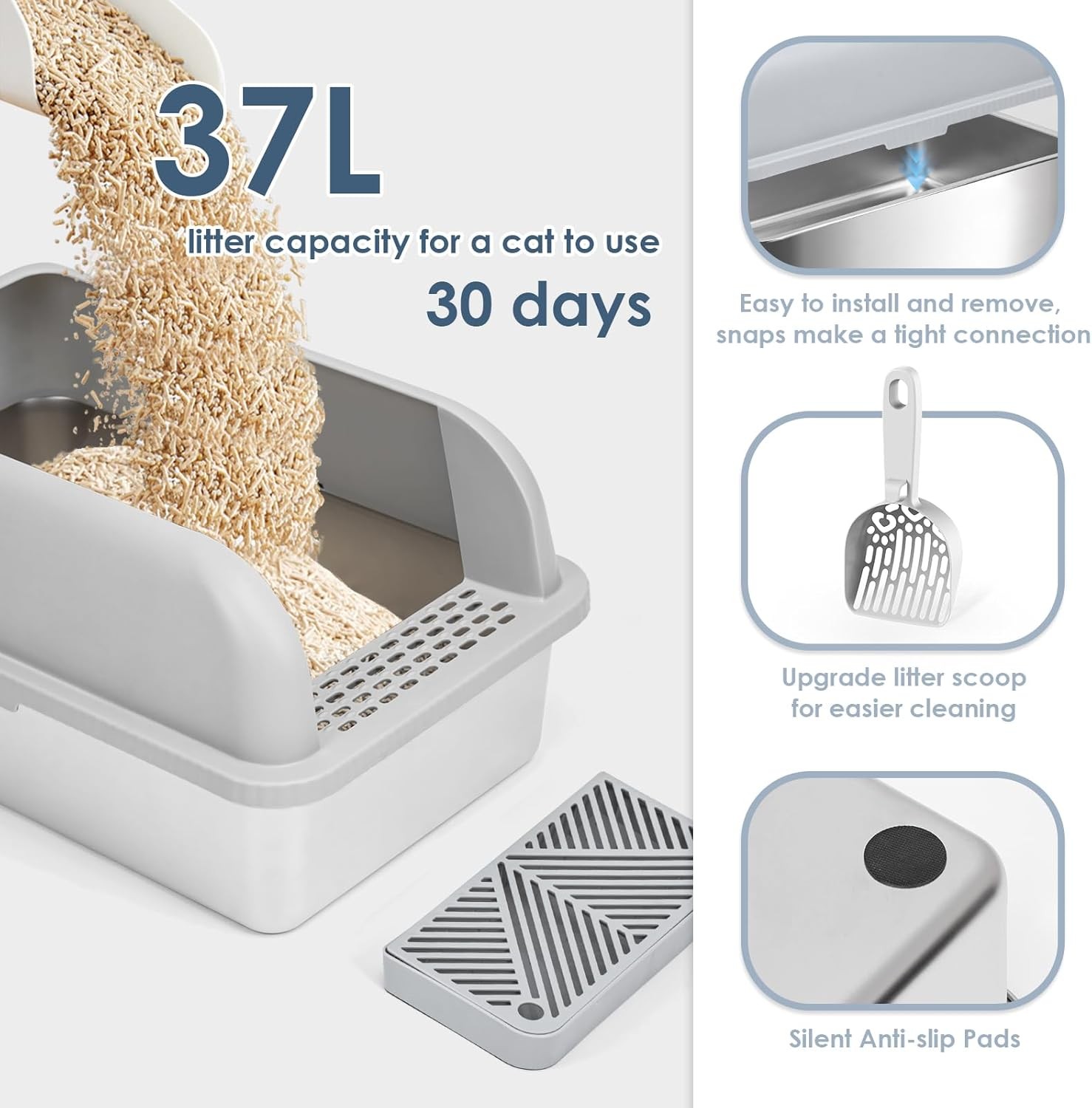 • Easier Maintenance - Come with a litter scoop and a wall-mountable scoop holder to make cleaning easier. The XL Stainless steel litter box for catio can hold up to 37L of litter, is enough for an adult cat to use for 30 days. No more worrying about changing cat litter when you go out to work or travel.